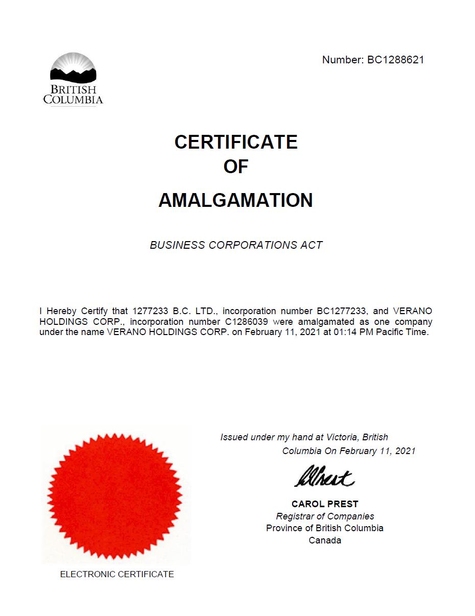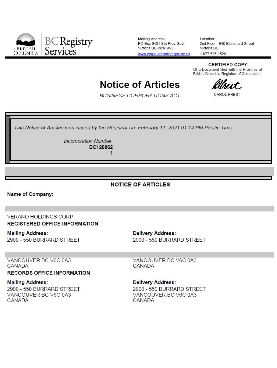 The Company will maintain the same corporate name “Verano Holdings Corp.”, business and assets and the Continuance completed by way of Arrangement is not expected to have a material impact on how the Company conducts its day-to-day operations. Our common stock will be registered with the SEC and we expect our common stock to be listed on Cboe Canada (“Cboe”) and quoted on the OTCQX in the United States. The Company is hopeful that the change in governing jurisdiction from British Columbia to Nevada will, among other things, enhance shareholder value over the long term. Please see “Overview of the Arrangement to be Voted on at the Meeting – Benefits of the Arrangement” for more information.