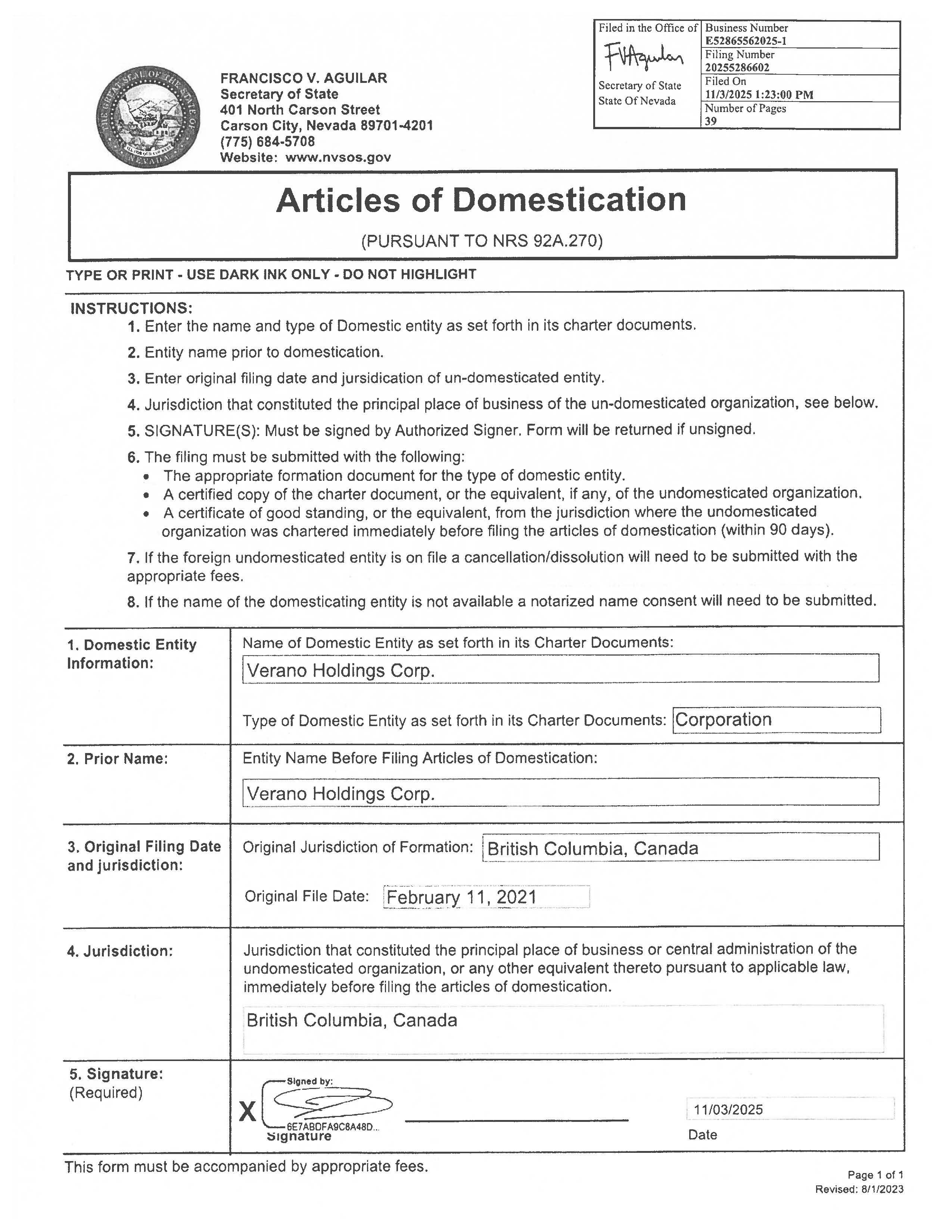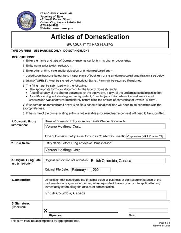 | 3.2 | Articles of Incorporation of Verano Holdings Corp., a Nevada corporation. | |